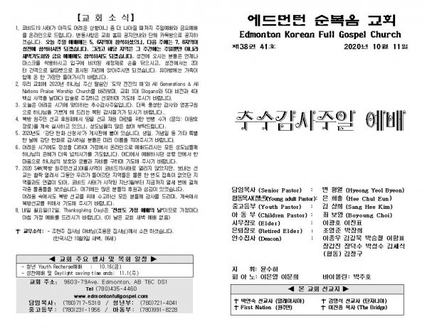 날짜: 2020.10.11 글쓴이 : 장갑진 | Sermon Summary
