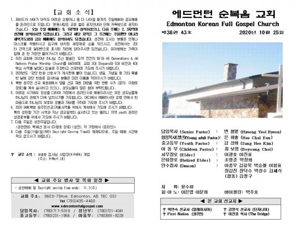 날짜: 2020.10.25 글쓴이 : 장갑진 | Sermon Summary