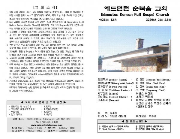 존귀하신 에드먼턴 순복음 교회 성도님들께-담임목사 변형열 드림
