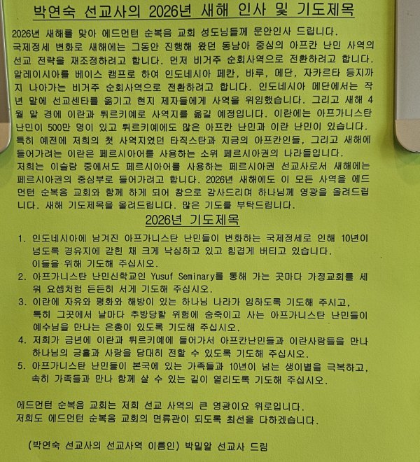 날짜: 2026.02.08 글쓴이 : 장갑진 | 박연숙 선교사 (말레이시아)