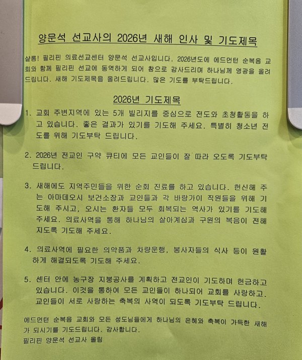 날짜: 2026.02.01 글쓴이 : 장갑진 | 양문석 선교사 (필리핀)